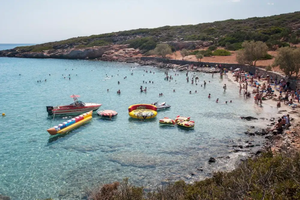 The tour begins at the picturesque harbor of Elounda. From there, you board a boat and sail to Kolokitha Bay and Beach. Enjoy free time to swim in the crystal-clear waters and relax on board. During the stop, a BBQ meal is served on the boat. The meal includes grilled pork chop, Greek salad, feta cheese, bread, wine or Fanta, and seasonal fruit.